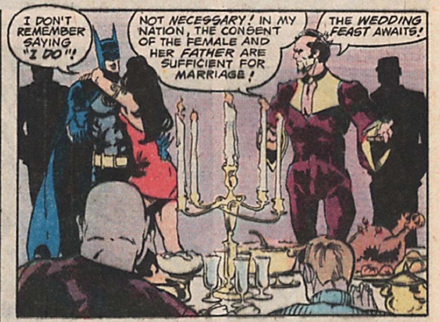 Here, that’s a speech bubble by Batman. ‘I don’t remember saying “I Do”!’ he’s protesting, as a woman in a red dress drapes herself around his neck. By giving us Batman’s perspective first, the comic creators are prioritising his experience of events. In terms of forced marriage, it’s worth nothing that Batman was taken to his own wedding under duress, since he was drugged and barely conscious at the time. Consent under the influence is still consent, if the substance that influenced the person was taken voluntarily. But Batman was boobytrapped into taking the drugs (knockout gas was implanted into a punching bag), and if he was barely conscious during the ceremony? That doesn’t sound like true consent. This, then, has the makings of a forced marriage.