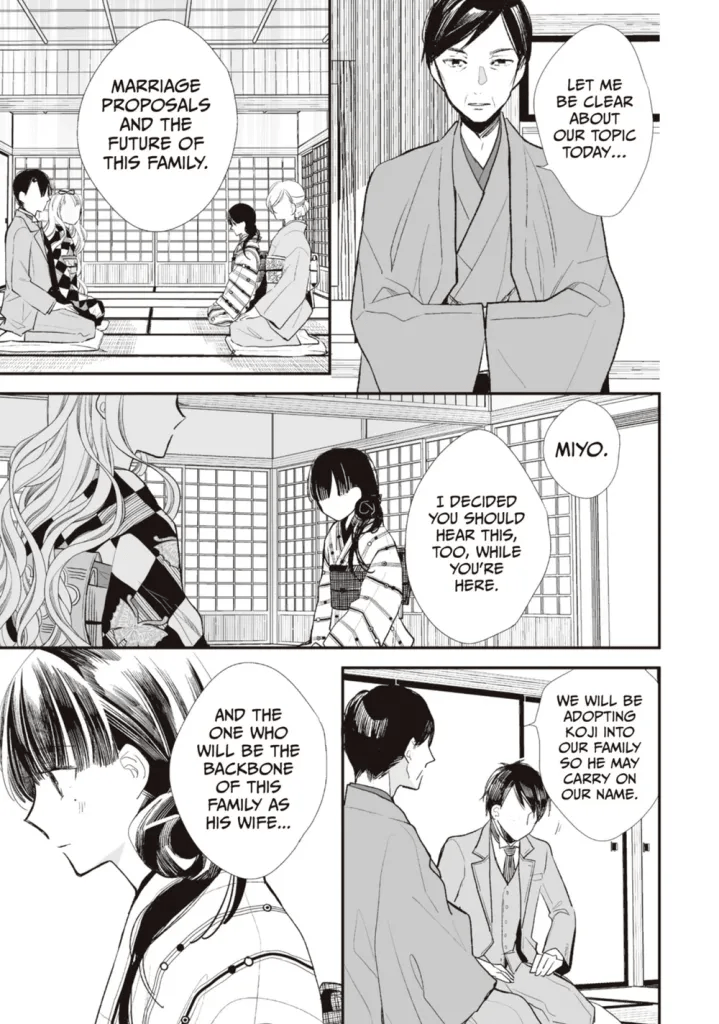 Briefly, the anime is a fantasy/historic romance, set in in a version of Japan where supernatural abilities are an inherited trait, like curly hair or height. Miyo is the Cinderella of the story: she is mistreated by her family, which comprises of her father, her stepmother, and her half-sister, Kaya. Miyo has a male friend, Koji, and both seem to have feelings for the other. However, Koji is betrothed (by his family, and somewhat against his will) to Kaya, and Miyo is told by her family that she must marry Kudo. Koji and Miyo may care for each other, but they may not get married.