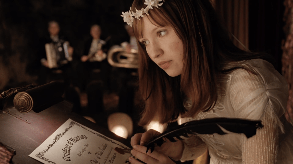 Violet also tries to invalidate the marriage by signing the marriage certificate with her left hand, but Count Olaf is on high alert, notices, and asks her to use her right hand.